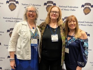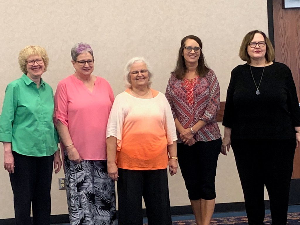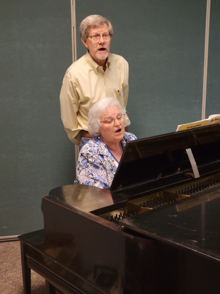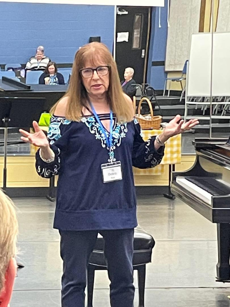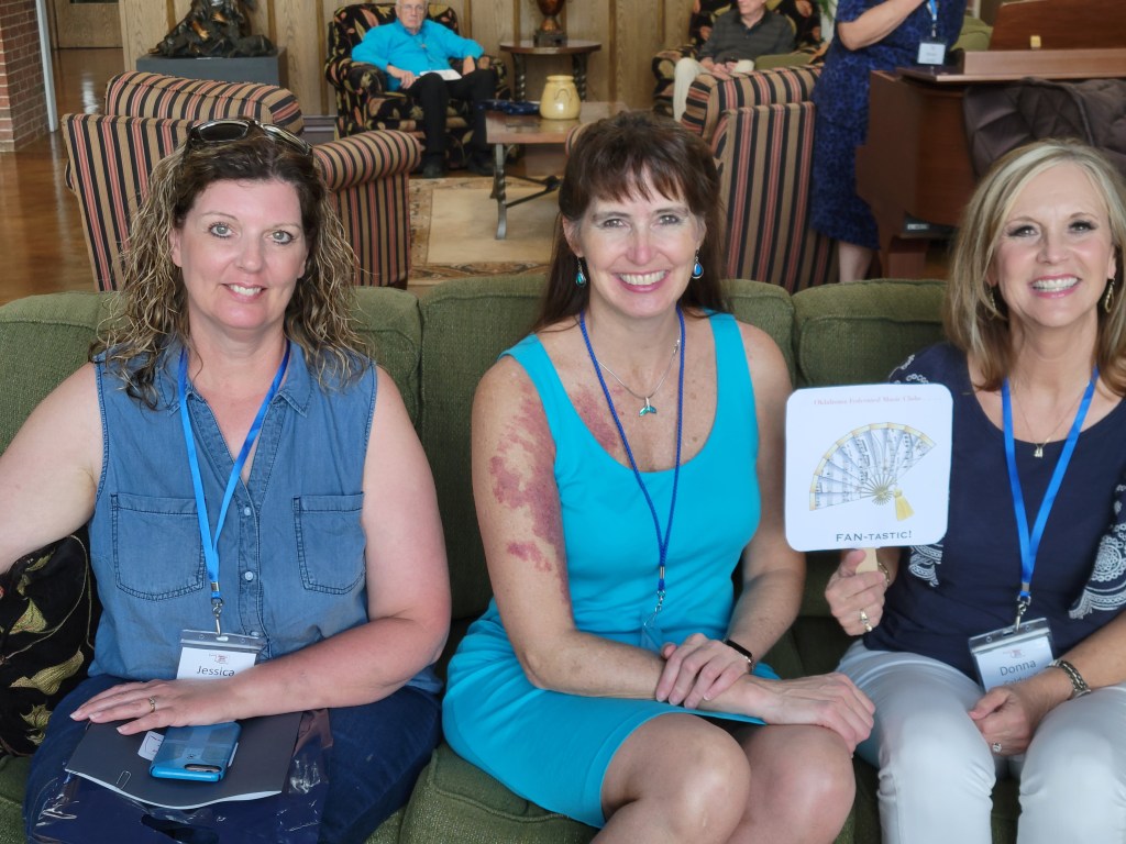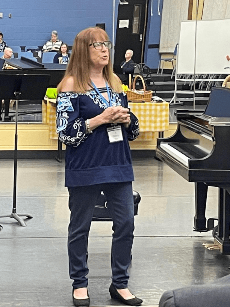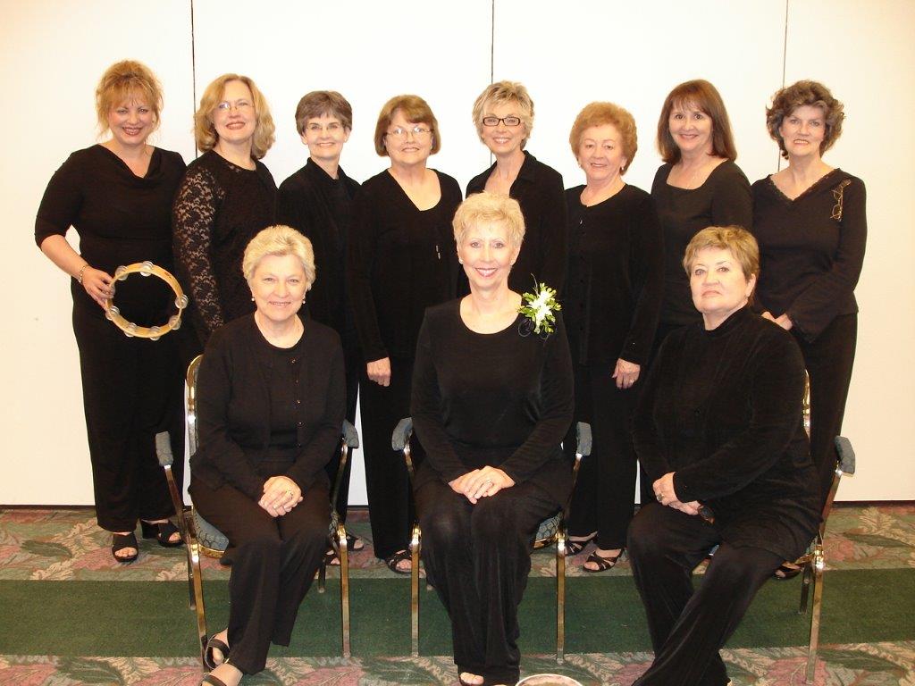 April 2008 State Convention. Leon Whitesell MOTY Chair presented the 2007 OFMC Musician of the Year, Nancy R. Cox, Altus club, seated in center wearing a corsage. She brought 10 Altus MacDowell Club of Allied Arts Club members, and directed them in singing for 15 minutes, more or less. Catherine Coke is on the back row, second from left, moving left to right.