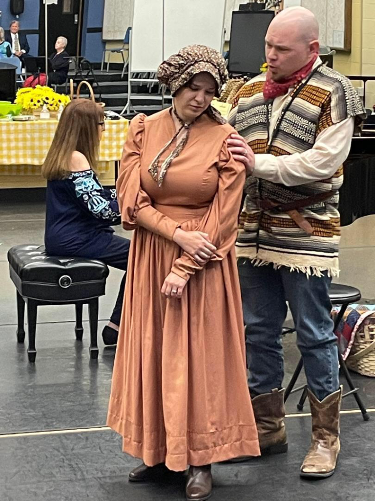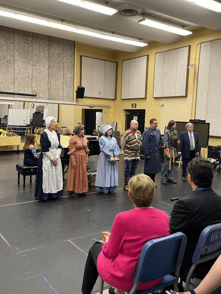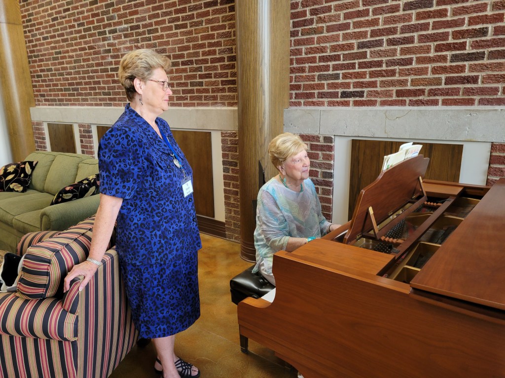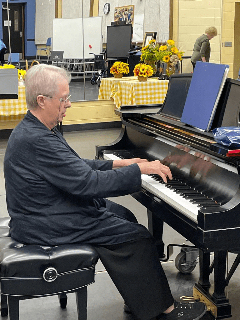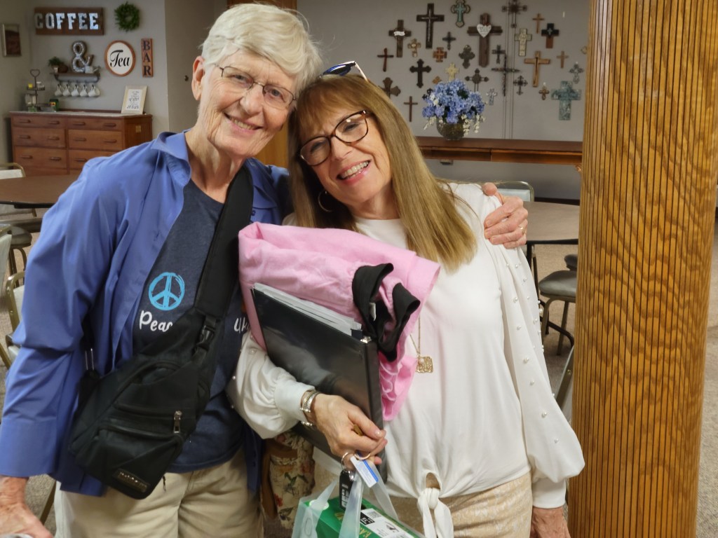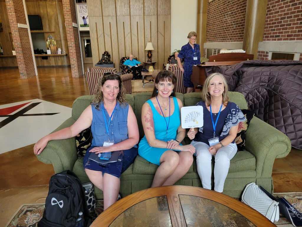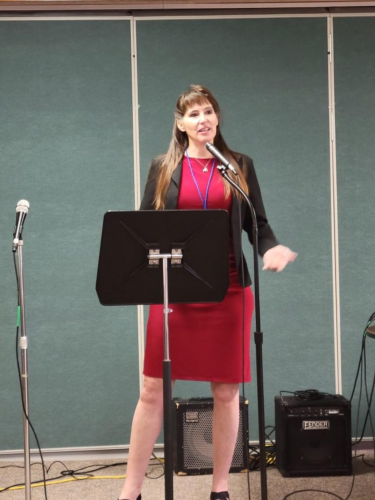 April 2008 State Convention. Leon Whitesell MOTY Chair presented the 2007 OFMC Musician of the Year, Nancy R. Cox, Altus club, seated in center wearing a corsage. She brought 10 Altus MacDowell Club of Allied Arts Club members, and directed them in singing for 15 minutes, more or less. Catherine Coke is on the back row, second from left, moving left to right.